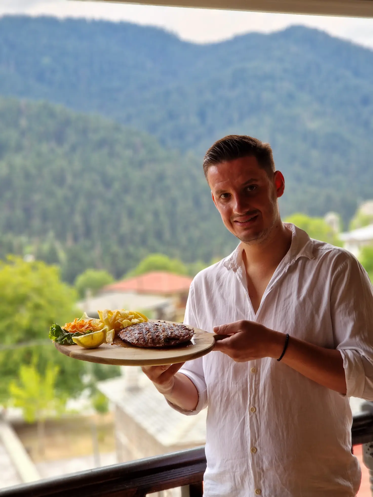 - Το Μοσχαράκι του Παναγιώτη, τη σπεσιαλιτέ του μαγαζιού μας, σιγομαγειρεμένο μόνο με λευκό κρασί από τους αμπελώνες των Μετεώρων, μαζί με λαχανικά και 4 είδη τυριών.